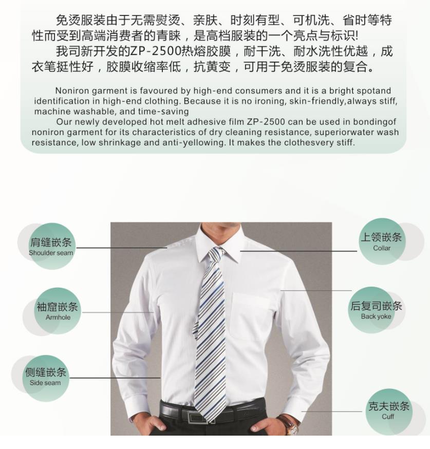 Использование подкладок из термоплавкой клейкой пленки на воротниках и манжетах одежды постепенно стало лучшим выбором для высококачественных рубашек, не требующих глажки.